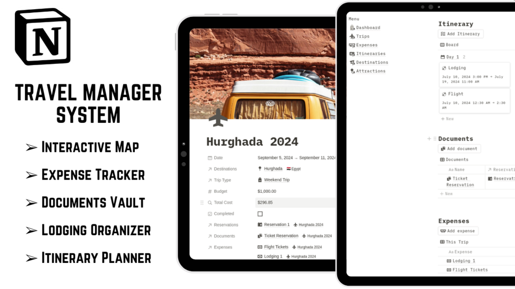 Organize your adventures like a pro! Travel Manager System is a powerful Notion template designed to streamline your travel planning.